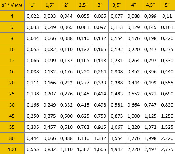 Ниже представлена таблица, в которой отражены отклонения угла гибки от 90° при разных отклонениях оси Y.