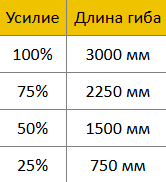 Длина гиба пропорциональна усилию, т.е. усилие достигает 100% только при длине гиба 100%.