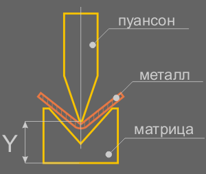 - Это значит, что угол гибки определяется положением оси Y, а не геометрией гибочного инструмента.