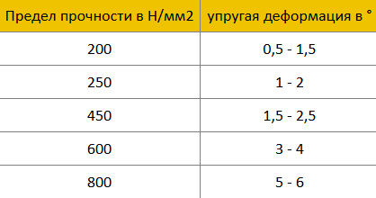 - предела прочности на растяжение: чем выше предел прочности, тем, больше упругая деформация;