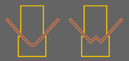 При этом методе угол гиба определен усилием гиба и гибочным инструментом: материал зажат полностью между пуансоном и стенками V образной матрицы. Упругая деформация равняется нулю и различные свойства материала практически не влияют на угол гиба.